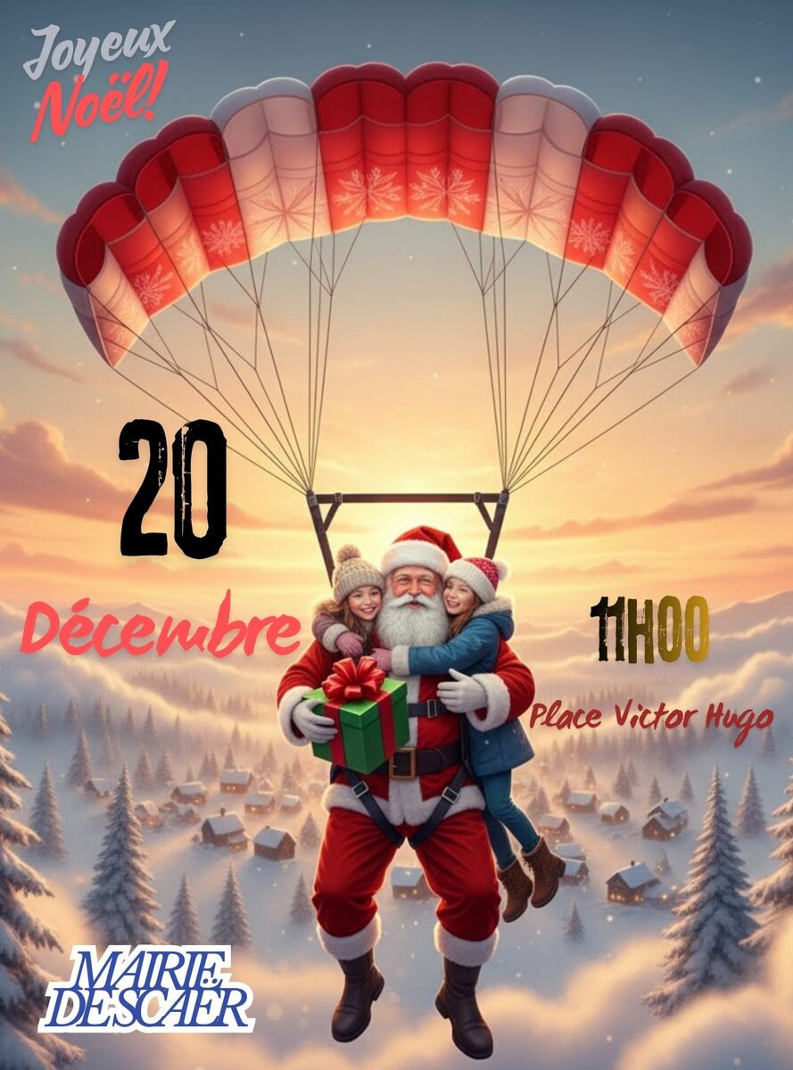 La mairie de Scaër a le plaisir d'annoncer que le Père Noël sera présent le 20 décembre, venant de l'école de parachutisme de Scaër. Il atterrira en parachute pour rencontrer les enfants de la commune. Sa hotte, remplie de délicieuses friandises, apportera joie et surprises. Les organisateurs espèrent que les conditions météorologiques seront favorables pour permettre ce saut à 11h00.
