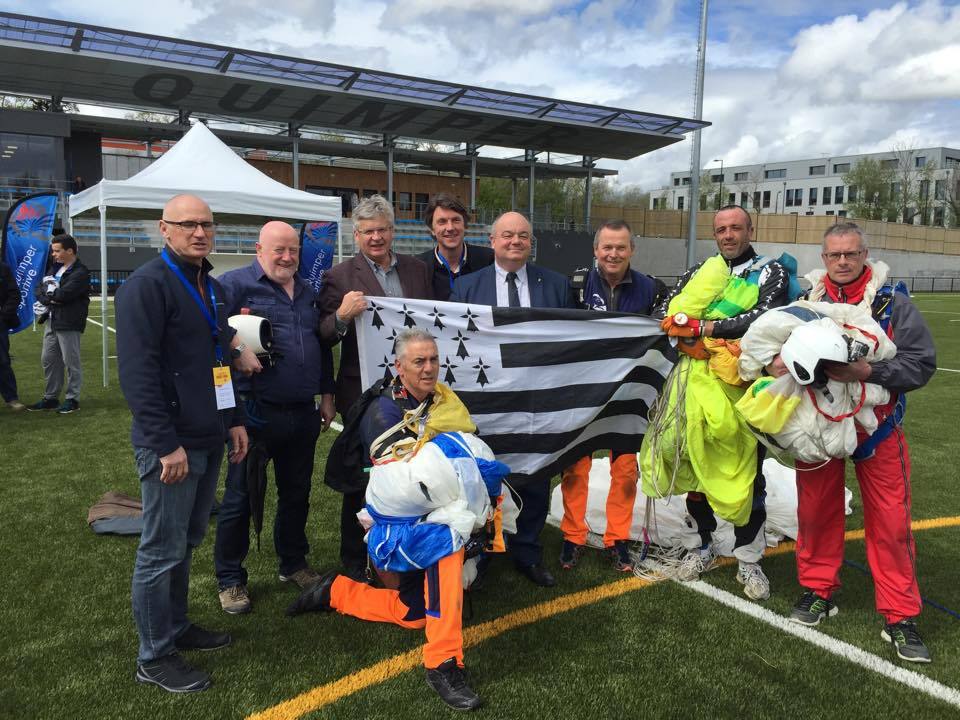Inauguration du stade synthétique de Football Américain à Creac'h Gwen de Quimper le mercredi 13 avril , en présence du Maire Ludovic JOLIVET de Quimper et des élus de la Mairie. Le Club de Parachutisme de Kemp-air parachutisme avec Daniel CHEVALIER et Jean-François LE MAT assistés de deux paras de l'école de Parachutisme de Bretagne Atlantique Roger VIEIRA et Jean-Philippe CHRISTIN.