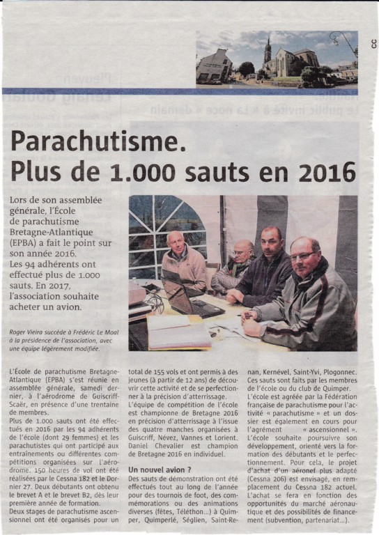AG DE L'ECOLE DE PARACHUTISME L'AG de l'Ecole de Parachutisme Bretagne-Atlantique s'est déroulée samedi 28 janvier 2017 dans les locaux de l'école, sur l'aérodrome de Guiscriff-Scaër en présence d'une trentaine de membres, de Mme Pédrono, présidente du SIVU de l'aérodrome, Mme Rioual, gestionnaire, M. Le Goff, maire de Scaër et des responsables du Comité Départemental de Parachutisme du Finistère, de la Ligue de Bretagne et des clubs locaux (Quimper, lorient). Plus de 1000 sauts ont été effectués en 2016 par les 94 adhérents de l'école (dont 29 femmes) et les parachutistes qui ont participé aux entraînements ou différentes compétitions organisées sur l'aérodrome. 150 heures de vol ont été réalisées par le Cessna 182 et le Dornier 27. 2 débutants ont obtenu le brevet A et le brevet B2 dès leur 1ère année de formation. 2 stages de parachutisme ascensionnel ont été organisées pour un total de 155 vols et ont permis à des jeunes (à partir de 12 ans) de découvrir cette activité et aux confirmés de se perfectionner à la précision d'atterrissage (une des disciplines du parachutisme). L'équipe de compétition de l'école est championne de Bretagne 2016 en Précision d'Atterrissage à l'issue des 4 manches organisées à Guiscriff, Névez, Vannes et Lorient et Daniel Chevalier est champion de Bretagne 2016 en individuel. Des sauts de démonstration ont été effectués tout au long de l'année pour des tournois de foot, des commémorations ou des animations diverses (fêtes, Téléthon...) à Quimper, Quimperlé, Séglien, St Renan, Kernével, St Yvi, Plogonnec par les membres de l'école ou du club de Quimper. L'école est agréée par la Fédération Française de Parachutisme pour l'activité "Parachutisme" et un dossier est également en cours pour l'agrément "ascensionnel". L'année 2016 est aussi satisfaisante sur le plan financier, même si les réglementations aéronautique européennes pénalisent lourdement le budget par l'imposition de nouveaux équipements sur les avions. L'école souhaite poursuivre son développement, orienté vers la formation des débutants et le perfectionnement et pour cela, le projet d'achat d'un aéronef plus adapté (Cessna 206) est envisagé en remplacement du Cessna 182 actuel, en fonction des opportunités du marché aéronautique et des possibilités de financement (subvention, partenariat...). L'AG de ce 28 janvier était aussi élective et Monsieur Roger VIEIRA succède à Monsieur Frédéric LE MOAL pour la prochaine mandature de 4 ans, avec une équipe légèrement modifiée. La reprise de l'activité est prévue début mars 2017 avec également une 1ère compétition "Coupe du Roi Morvan" les 25 et 26 mars qui sera la 1ère étape du championnat de Bretagne 2017 de Précision d'Atterrissage. Les sauts de découverte de la chute libre "en tandem", sont proposés toute l'année et toutes les personnes intéressées peuvent contacter l'école au 06 67 88 03 09 ou epbaguiscriff@gmail.com pour les informations ou réservations. Site :epba-parachutisme.sportsregions.fr/