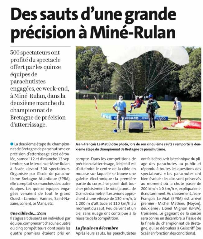 Un week-end sous le soleil pour cette 2ème étape du championnat de Bretagne de parachutisme en précision d'atterrissage à Scaër les 12 et 13 Septembre. L'équipe du Finistère remporte cette compétition en équipe et en individuelle avec les sportifs de Kemp-air Parachutisme et de Scaër ( Lionel MIGNON-Hervé COZ-Daniel CHEVALIER-Jean-François LE MAT ) La 1ère Place en individuelle pour Jef LE MAT et 1ère Place par équipe à l'école de parachutisme de Bretagne Atlantique.