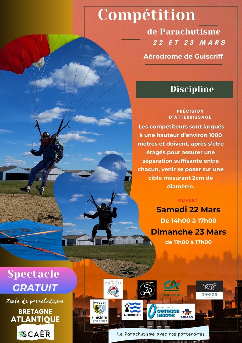 L'école de parachutisme de Scaër, est ravie de vous annoncer son événement sportif comptant pour la première étape du Championnat de Bretagne, qui se déroulera sur l'aérodrome de Scaër-Guiscriff. Pour l'occasion, le parachutisme sera mis à l'honneur dans l'organisation d'une compétition de précision d'atterrissage qui regroupera les meilleurs compétiteurs de la région Bretagne.