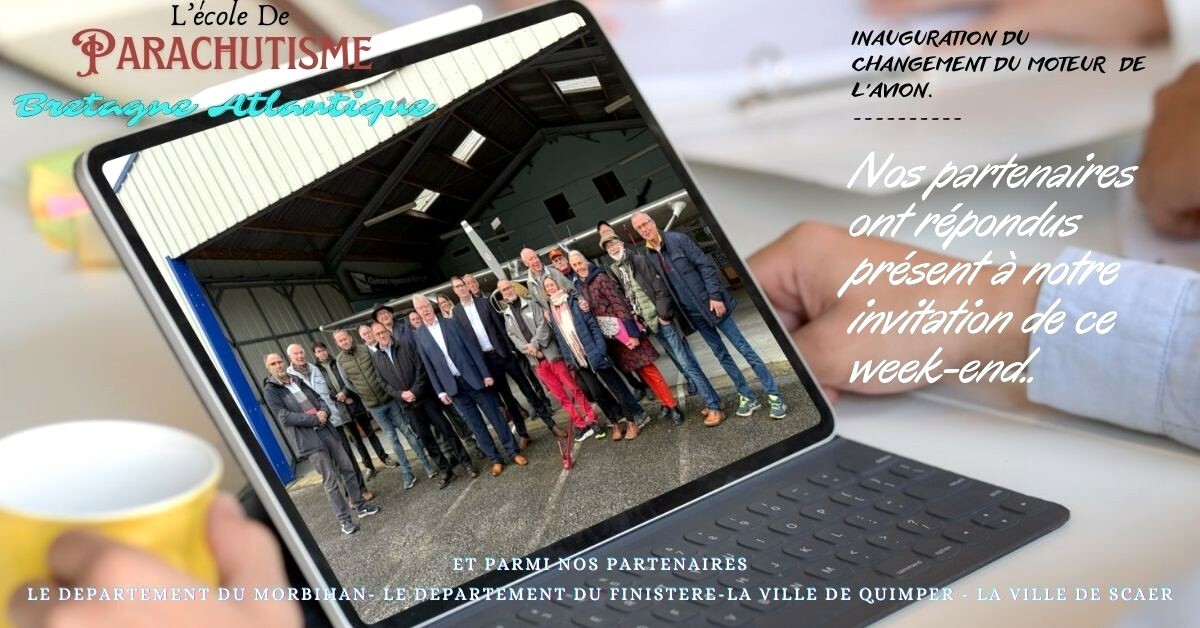 Inauguration du nouveau moteur de l'avion de l'école par les partenaires ( Département du Mobihan-Département du Finistère- Mairie de Quimper- Mairie de Scaër - Huit à huit de Guiscriff - Sébaco - G2L - Axintra - Dépann éclair )