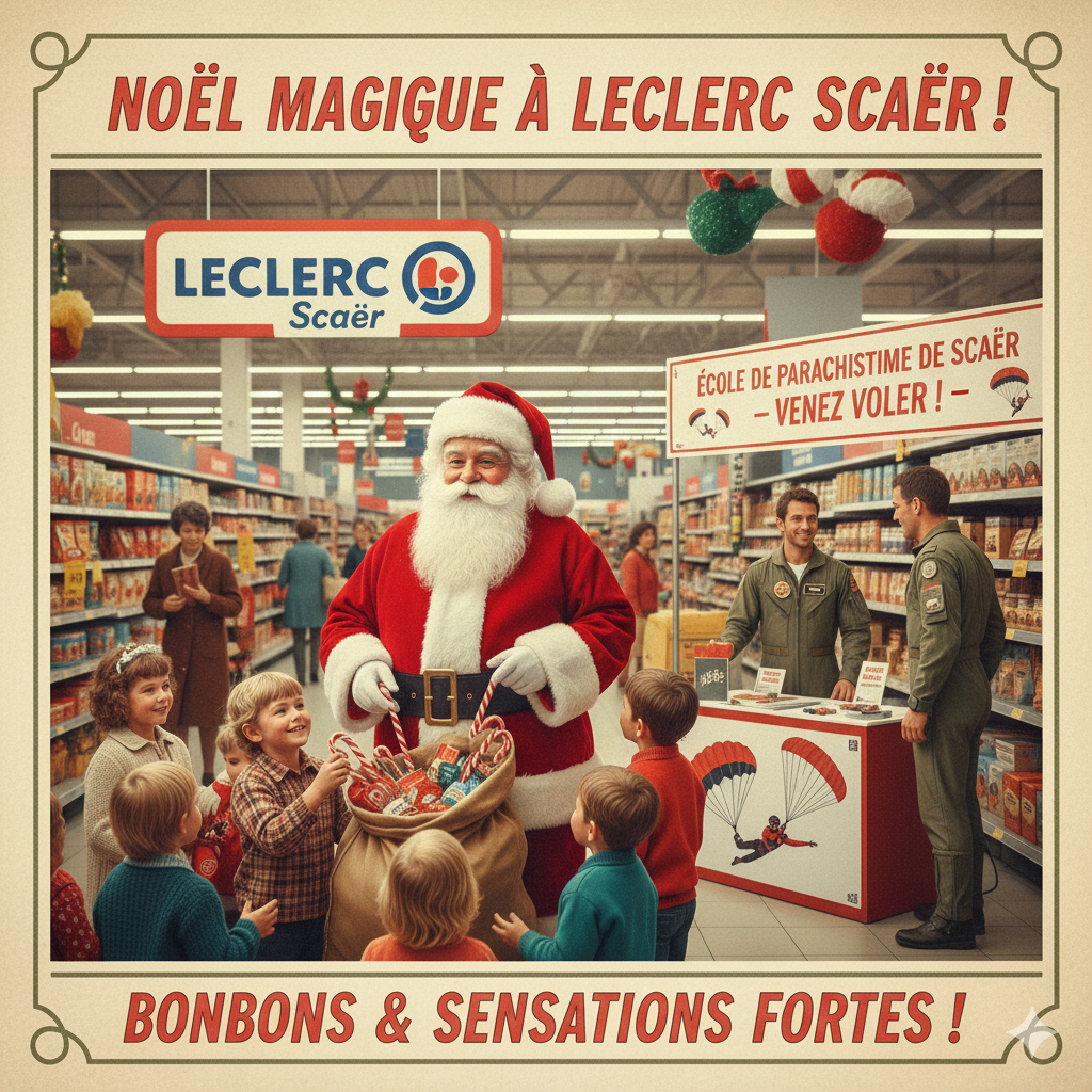 Le Père Noël sera présent demain au centre Leclerc de Scaer, accompagné de l'école de parachutisme. Il distribuera des friandises aux enfants et proposera des sauts en parachute pour les plus audacieux.